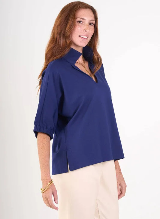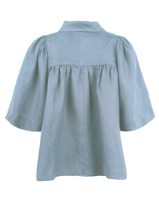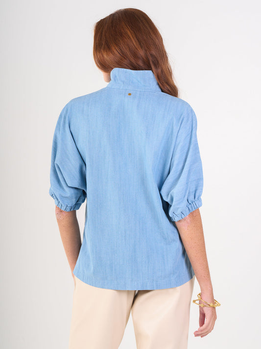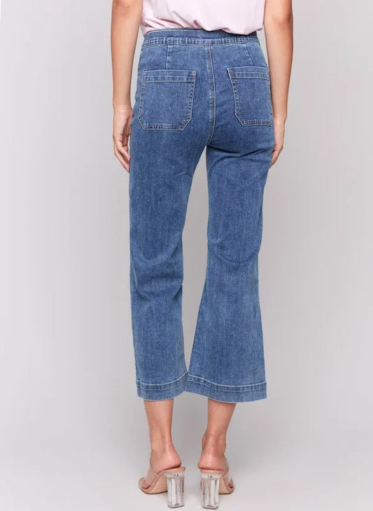 Denim Pull on Flare pant with front button/ Bleu Moyen