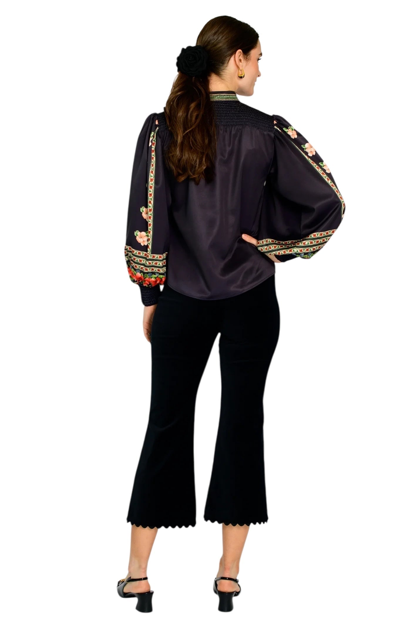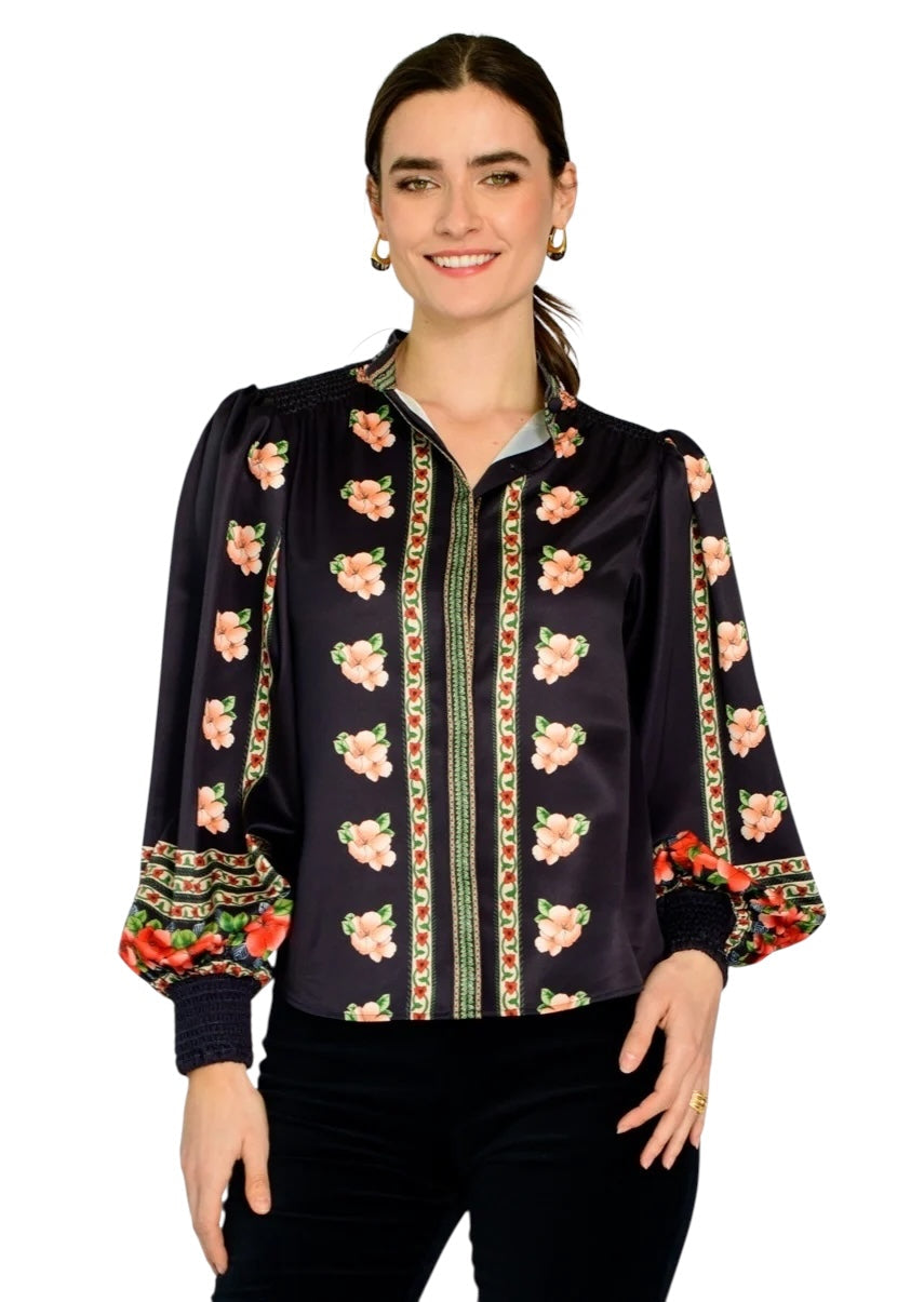 The Emily Top is the perfect button front blouse, featuring a mandarin collar, covered placket, and balloon sleeves. This season, she is cut from a soft satin fabric in our Garland Stripe print, great for dressing up or down this season.