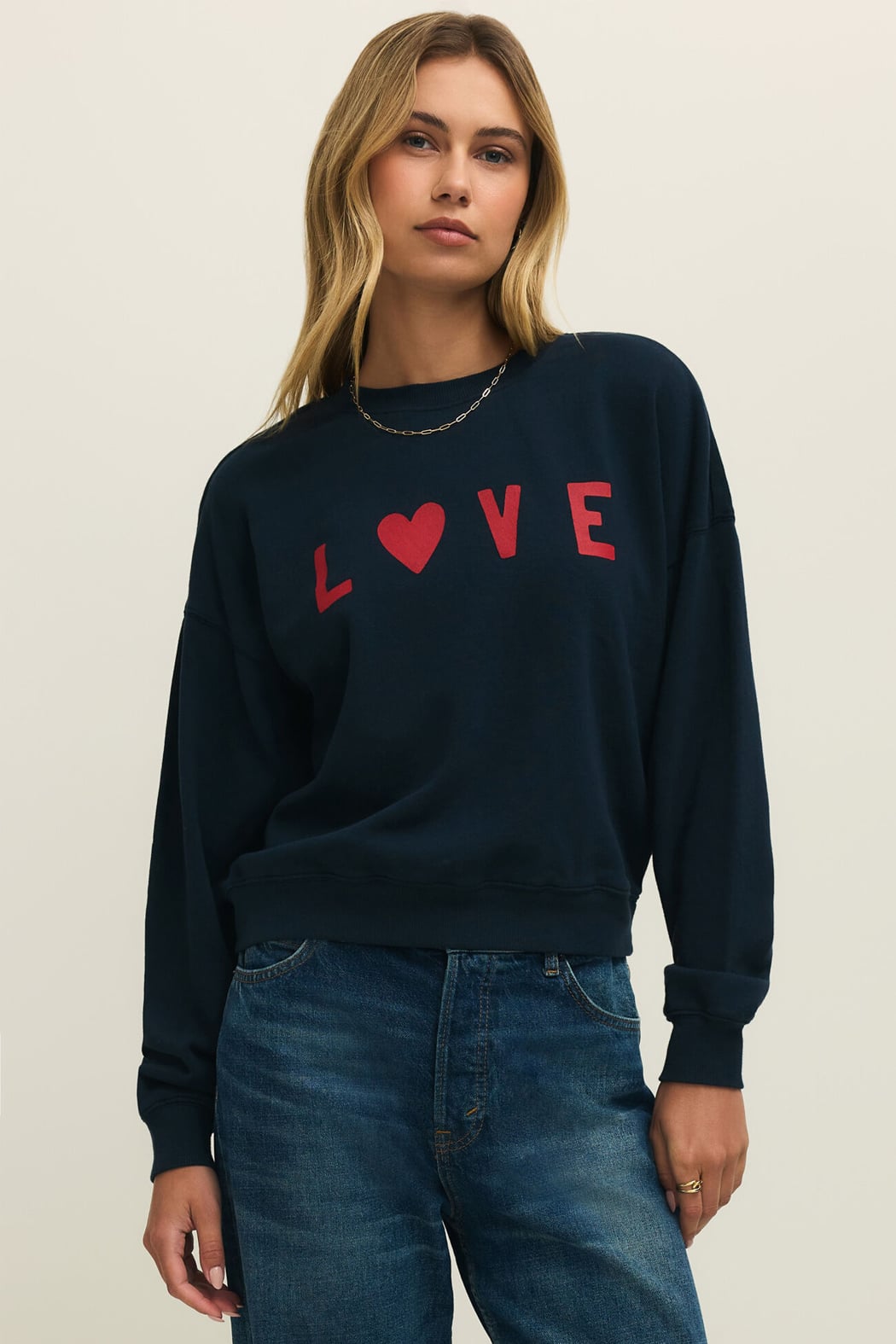 This ultra soft cotton fleece lined crewneck sweatshirt in navy features a red graphic displaying the word "love" in red with a heart in place of the "o". The perfect comfy sweatshirt that can be dressed up or down and a perfect valentines day gift for a loved one